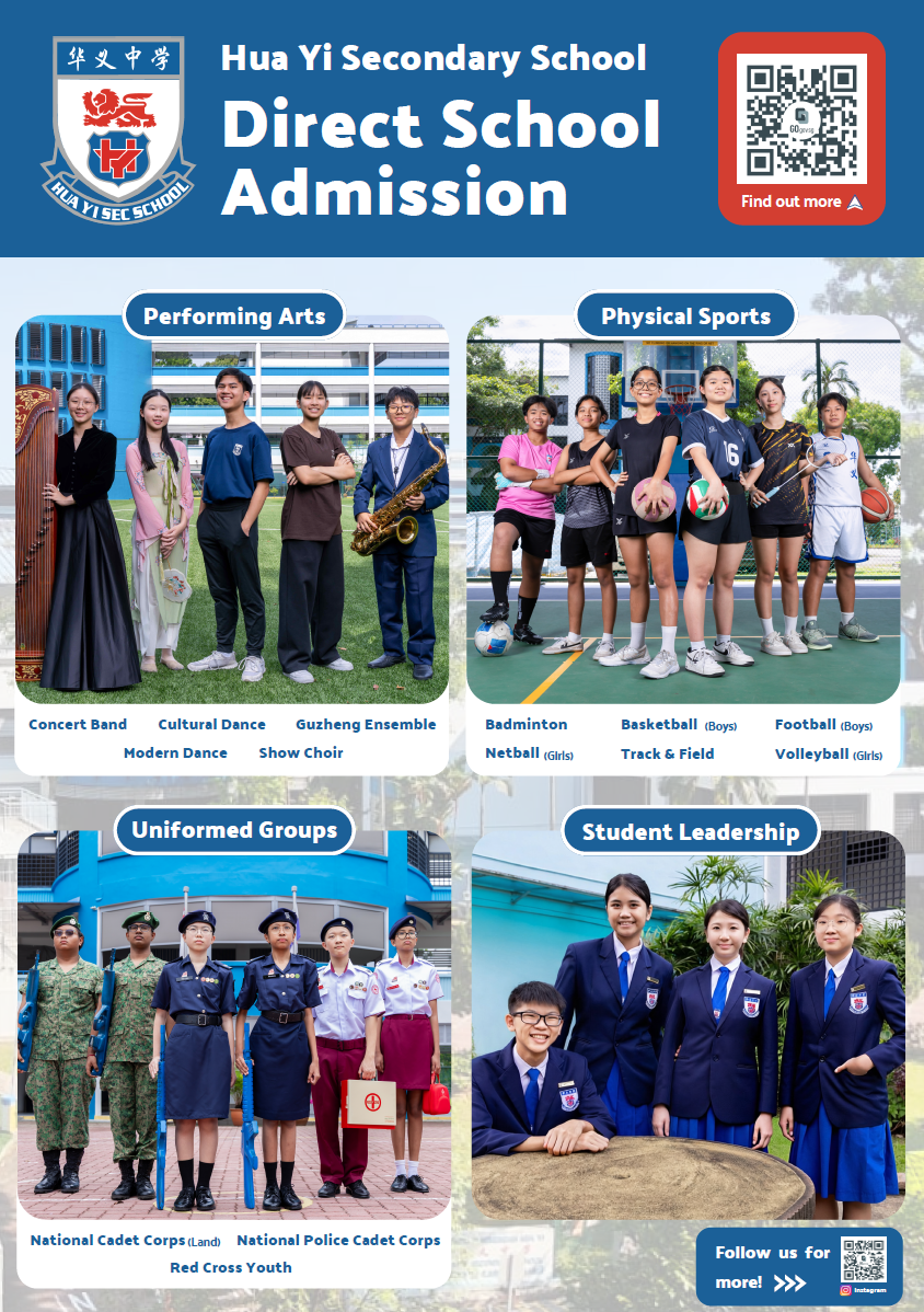Hua Yi welcomes prospective students with passion and talents from various fields, representing the different aspects of our holistic curriculum, to join the Hua Yi family through the Direct School Admission-Secondary (DSA-Sec) Exercise.