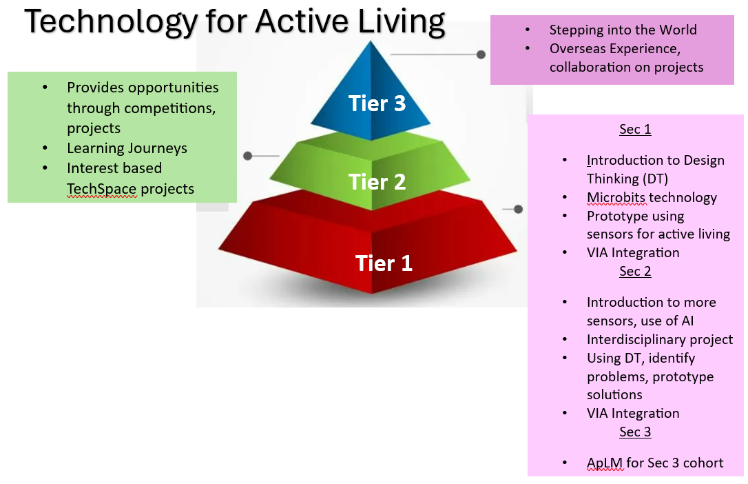 In ALP in Hua Yi aims to equip students with the skills and mindset needed to thrive in a rapidly evolving digital world. It fosters confidence in problem-solving, promotes lifelong learning, and applies STEM concepts through a Design Thinking approach. Additionally, it develops essential 21st Century Competencies and Social-Emotional skills such as critical thinking, communication, and situational awareness. The programme is tiered at three levels as shown in the diagram above.